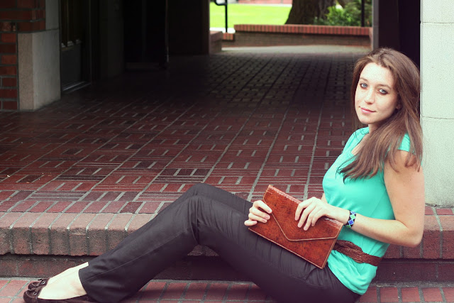 Top: Ann Taylor LOFT; Slacks: The Limited; Belt, shoes: American Eagle (similar belt, similar shoes); Clutch: Vintage snakeskin clutch handed down from my mother; Bracelet: bought in Durban, South Africa by my boyfriend from the Hillcrest Aids Center Trust